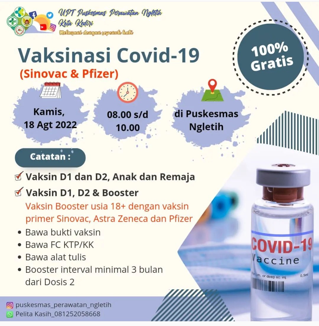 puskesmas_perawatan_ngletih Hallo sobat, ini ada info Vaksinasi Covid 19 1. Vaksin D1 dan D2 untuk anak dan Remaja 2. Vaksin D1, D2 dan Booster untuk 18+ dan…