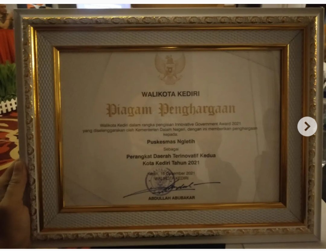 Salah satu penghargaan dari KEMENTERIAN KESEHATAN REPUBLIK INDONESIA yang diberikan kepada PUSKESMAS PERAWATAN NGLETIH adalah " Sebagai Fasilitas Pelayanan Kesehatan Yang Telah Melaksanakan Penghapusan Alat Kesehatan Bermerkuri 100% " Tahun 2020