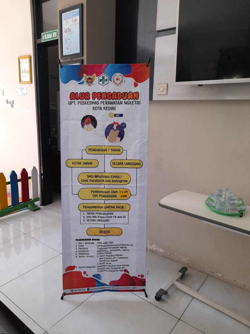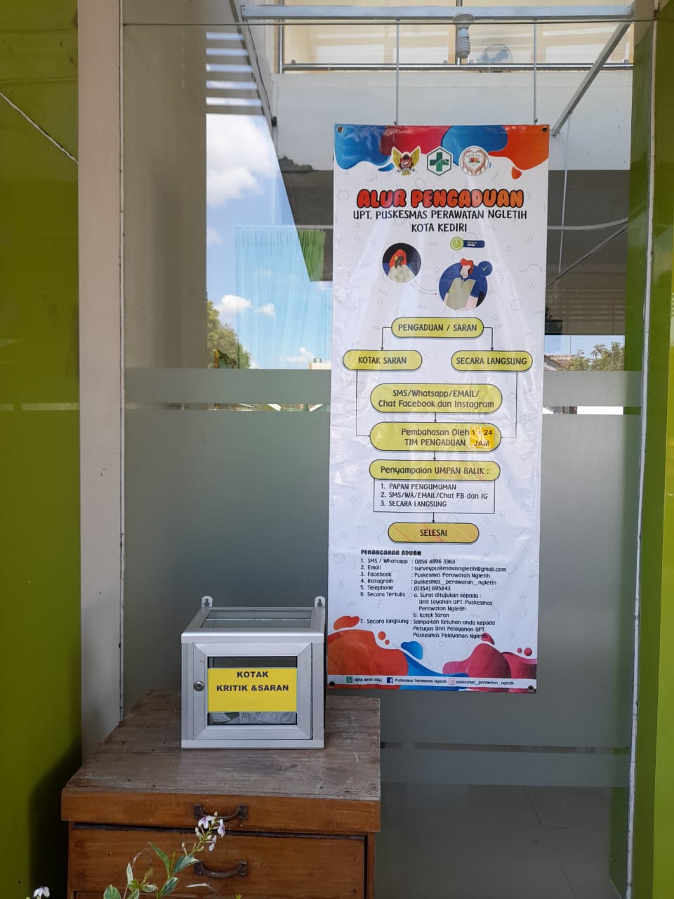 Alur pengaduan di Puskesmas Perawatan Ngletih bisa melalui SMS/WA (085648963363), Instagram, Facebook, email, telpone (0354) 695843, serta melalui Kotak saran.